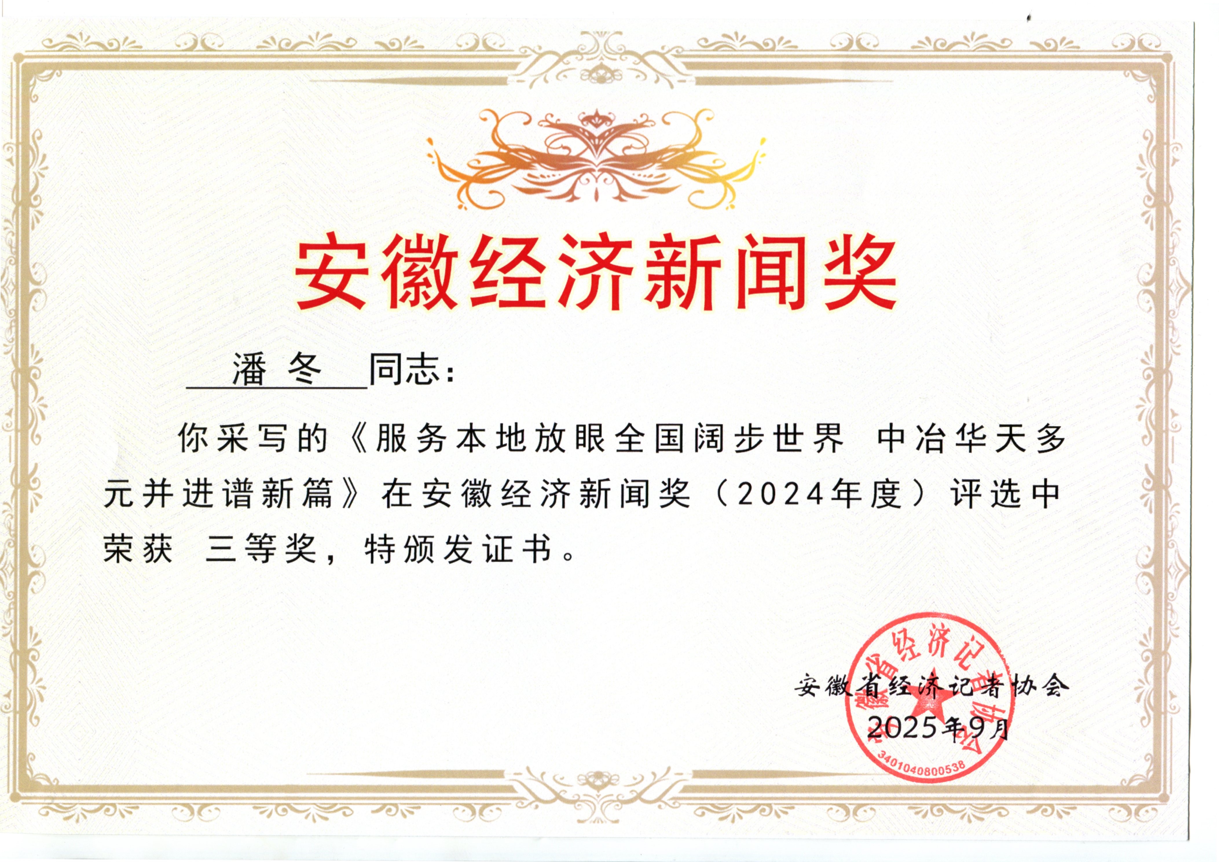 近日,中冶华天收到安徽(huī)省经济记者协会颁发的获奖证书,由公司党群工作部(bù)(党委宣传部)员工(gōng)潘冬采写的(de)新闻稿件《服务本地放眼全国(guó)阔步世(shì)界 中冶华天多元并进谱新篇》获评安(ān)徽经济新(xīn)闻奖三等奖(jiǎng),有(yǒu)力彰显了公司推动再转型(xíng)再升级的(de)最新成绩和用心策划宣传的积极作为,是对其高质量发展实践与品牌传播成(chéng)效的双重肯定。