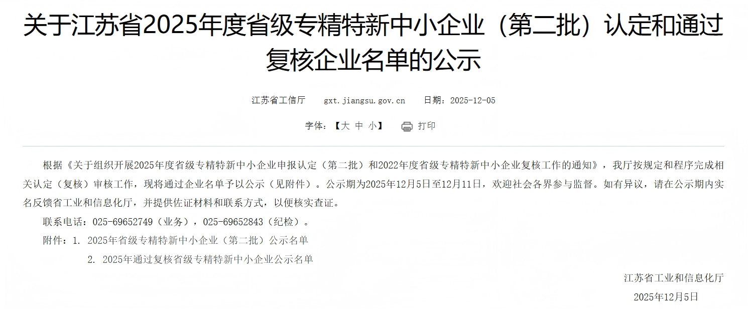 据了解,“专精特新”是(shì)企业核心竞争力的体现,代表着企业在细分市场内技术领先、质量精良、管理(lǐ)规范。“十(shí)五(wǔ)五”规(guī)划明确提出“促进中小企业(yè)专精(jīng)特新发展,培育独角兽企业”,为企业锚定高(gāo)质量发展路径。省级专精特新中小企业作为各省培育优质中小企业的权威(wēi)认证,聚焦(jiāo)于专注细分市(shì)场、创新能力(lì)强、市场占有率高、掌握关键核心技术(shù),既是衡量企业在细分领域竞争力与发展潜力的重要标尺(chǐ),也与国家战略(luè)导向高度契合。