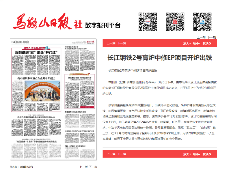 On the afternoon of March 5, the No. 2 blast furnace medium maintenance EP project of Anhui Changjiang Steel Co., Ltd. designed and supplied by MCC Huatian was successfully ignited, blowed-in and tapped at 7: 50 am on the March 6.
