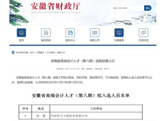 12月18日,安徽省财(cái)政厅(tīng)公布“安徽(huī)省高端会计人才”(第八期)录取人员名单,经过材料评审、现场笔试、专家面试等多轮考核,中冶华天财务管(guǎn)理部员工段震从众多候选人中脱颖而出、成功入选,有力展现(xiàn)了华天财务人员的综合(hé)实力与(yǔ)向上风采!